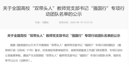 9月19日,教育部思想政治工作司公示了全国高校“双带头人”教师党支部书记“强国行”专项行动团队名单,我院教师党支部书记孟超同志成功入选。