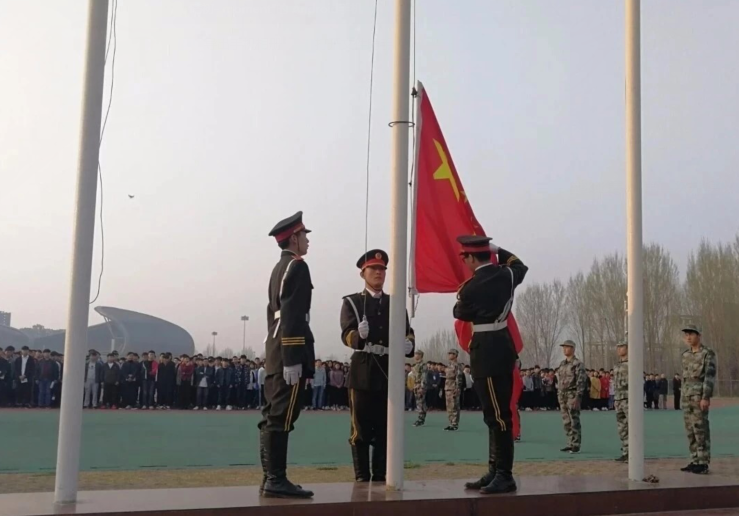 伴随着国歌的节奏,国旗班升旗手熟练的挥动五星红旗,全体师生面向国旗行庄严的注目礼。国歌奏毕,五星红旗升至顶空,全体师生礼毕。