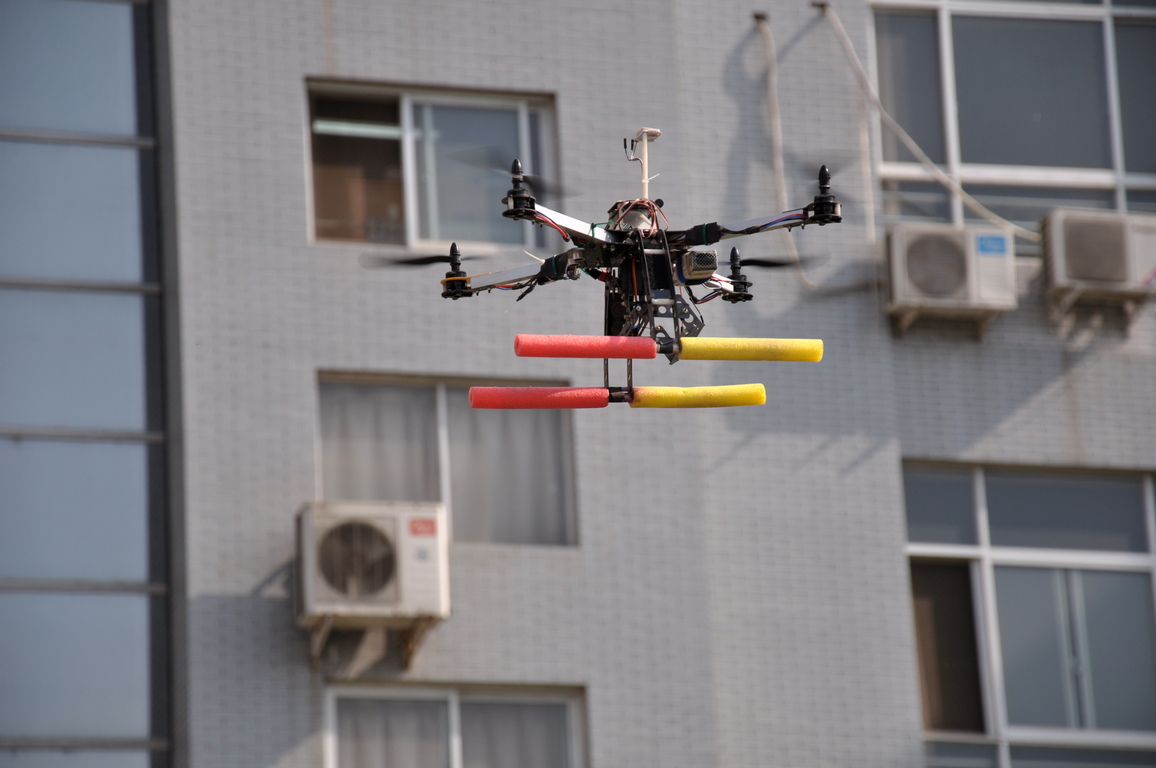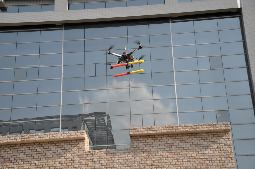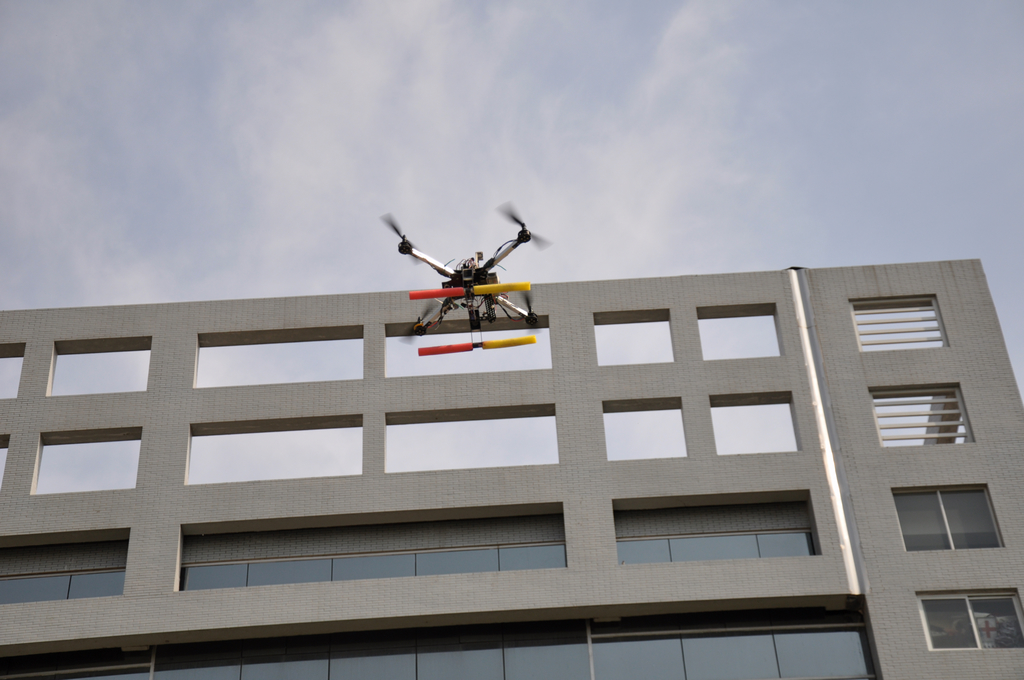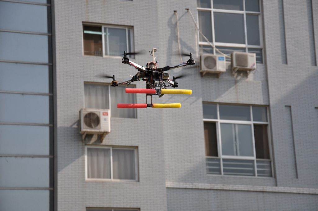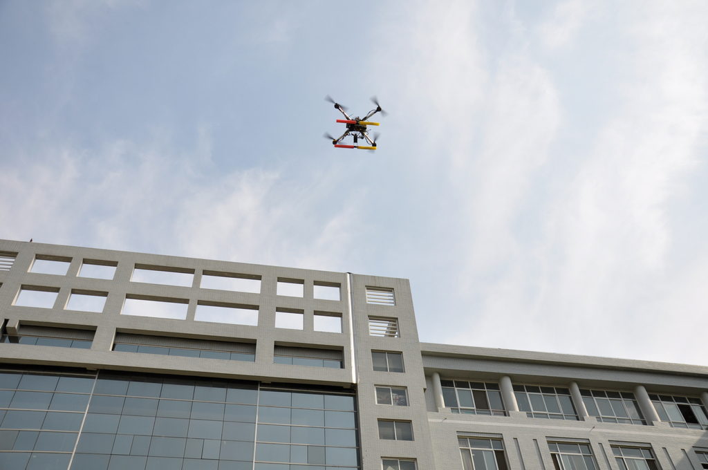 以下图片是稍早前丁飞和多轴飞行器的试飞画面。