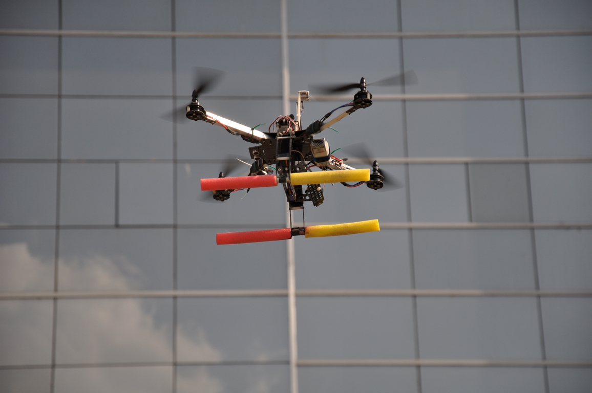 该四轴飞行器由一组锂电池提供动力,飞行可控距离500米,单节电池续航10分钟;可以进行实时无线影像传输;GPS定点飞行,自动返航;定高度飞行;空中拉烟;抗风能力3级。
