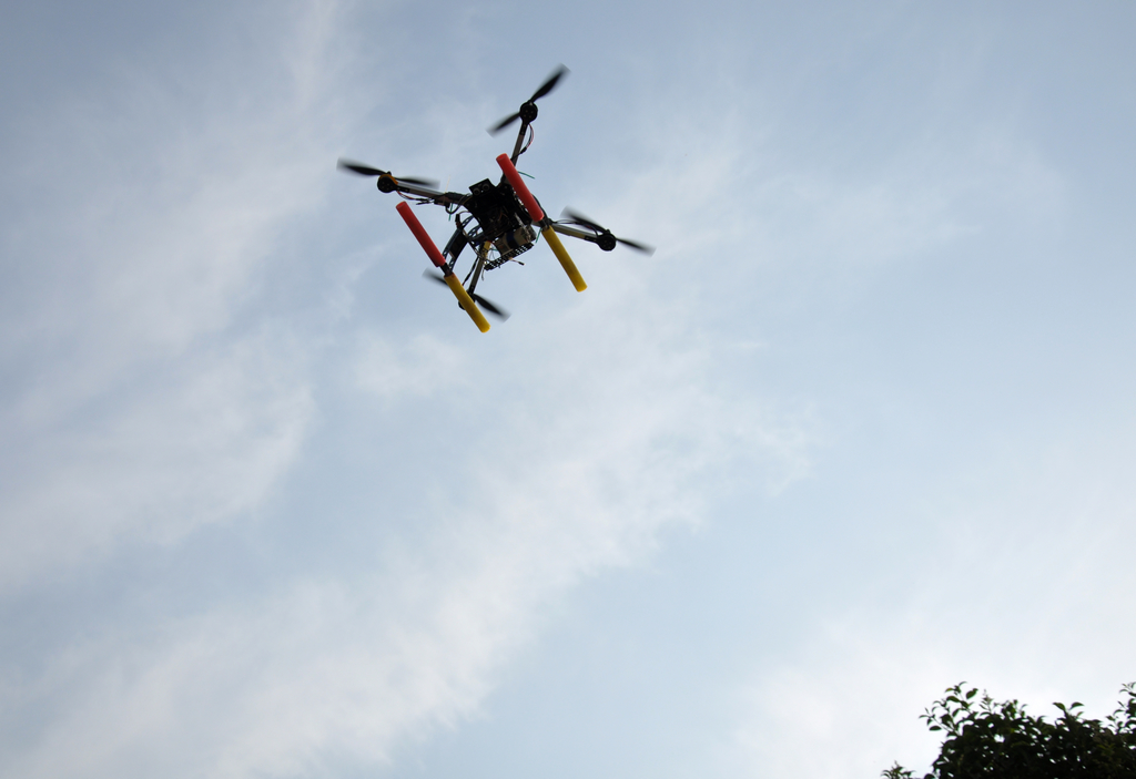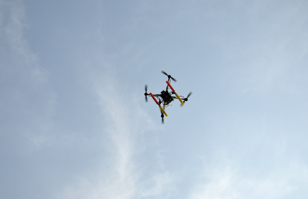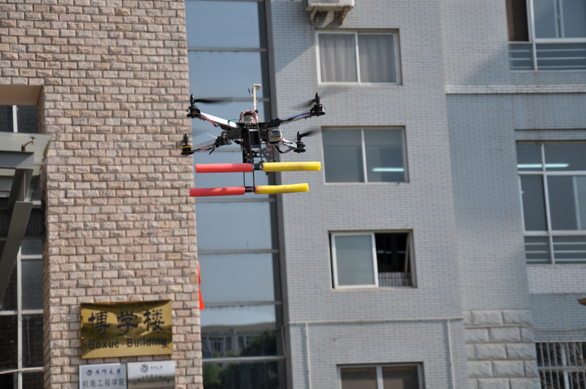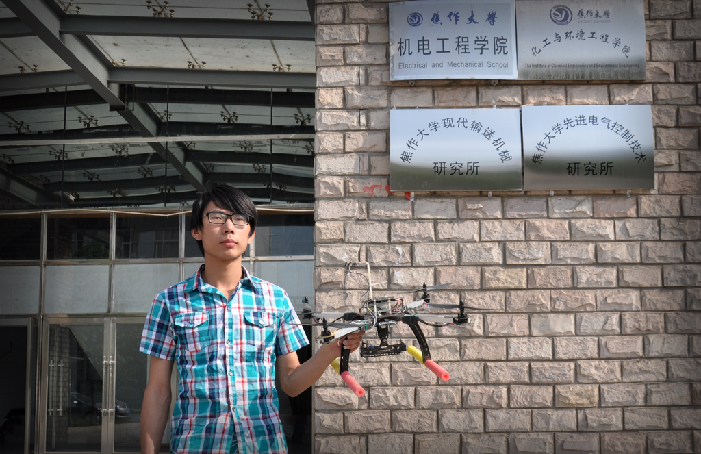 yl23411永利集团2011级机械制造与自动化专业1班学生丁飞,来自河南濮阳,学习之余用了3个多月的时间,设计制作了一个多轴飞行器,日前在校园进行了演示。