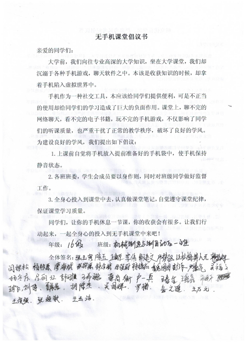 为推动学习风气的积极建设,营造良好的学习和生活氛围,提高课堂教学质量,创造更好的课堂听课学习环境。2018年6月4日,由yl23411永利集团学工办主任孙备老师主持开展了一次关于课堂无手机的落实倡议签字活动。