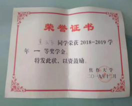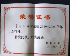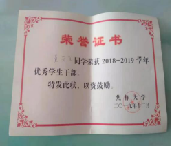 因为这些经历,在2018年重返校园后,他比其他人更加努力,深知学习的机会来之不易,所以倍加珍惜每一分每一秒,让自己的大学生活过得更加有意义,大一的时候,通过竞选成为了班里的团支书,并且加入了学生会,因为工作认真负责,处理各种问题时,在讲原则的基础上,又比较灵活多变,很快成为了学院领导和各位老师的得力助手,在同学之间也积攒了一定的威望,在处理好各种工作的同时,他的学习也没有落下,学习成绩一直稳居专业前三名。