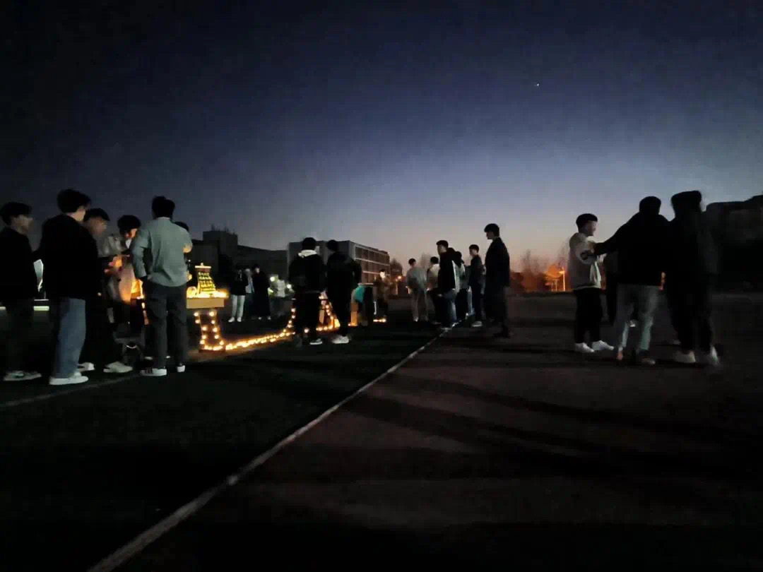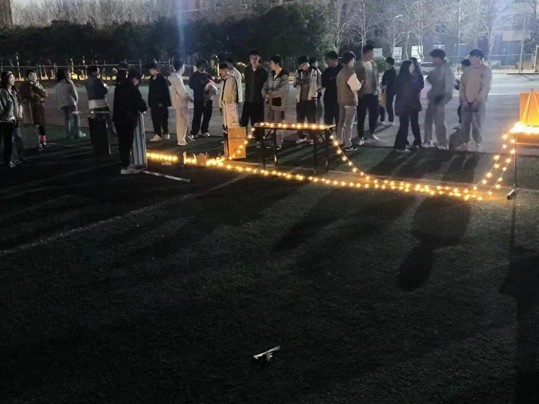 夜幕逐渐降临,本该越发冷清的操场上,同学们却不约而同的来到操场上,小小的彩灯发出暖暖的光,操场逐渐热闹起来!