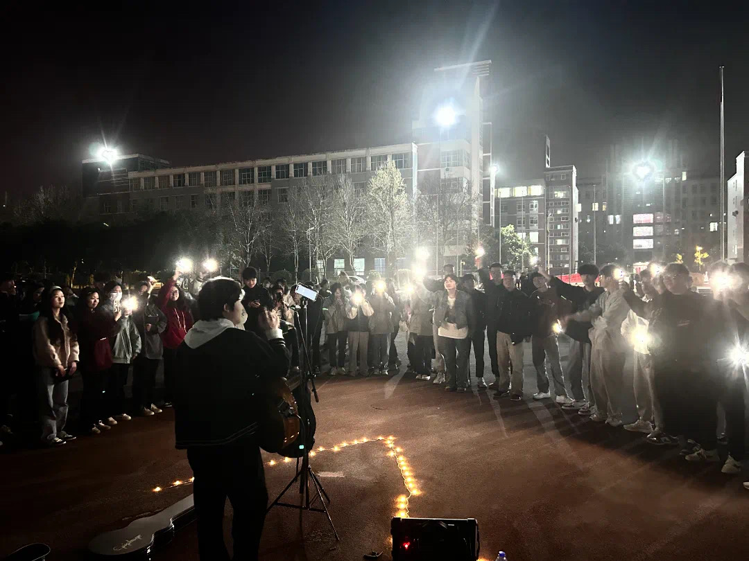 夜幕的灯光下,围观吉他社团歌唱表演的同学们,挥着手中的灯光,在歌声与吉他声中,绽放着属于青春的色彩!