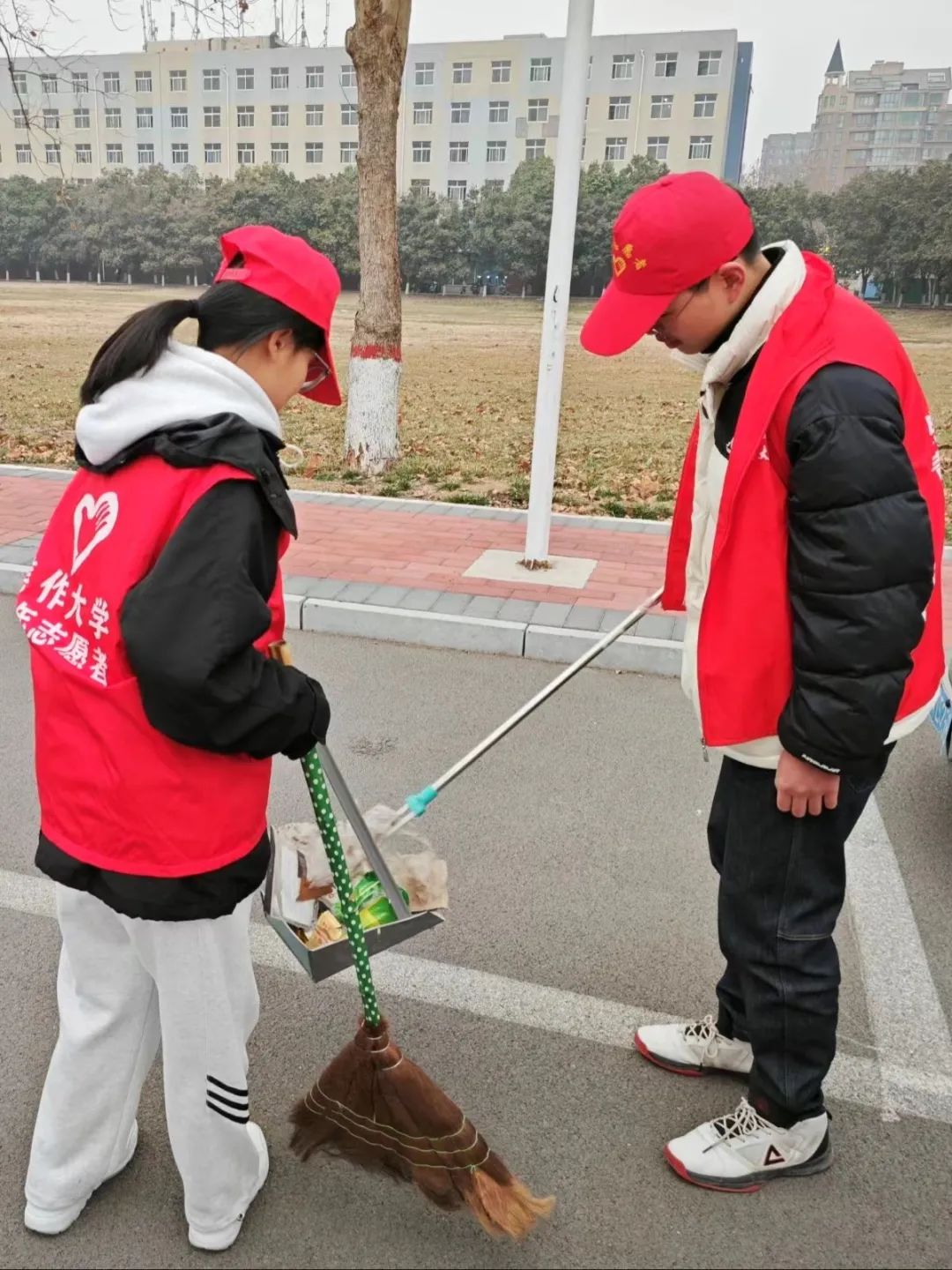 志愿者们耐心清扫路面