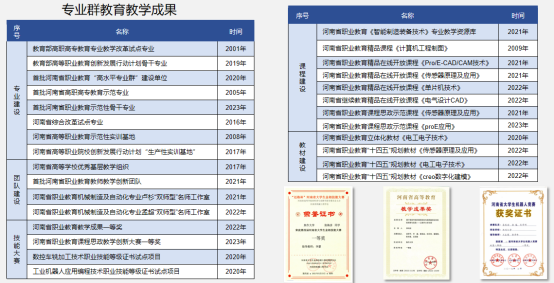 经过多年的努力与发展,学院在专业建设方面已经取得了一系列丰硕的成果。教育部高职高专第二批教育教学改革试点专业;教育部高等职业教育创新发展行动计划“骨干专业”;河南省职业院校“高水平专业群”建设单位;河南省高职高专教育示范专业;河南省职业教育示范性骨干专业;河南省高等职业教育创新发展行动计划“骨干专业”;河南省高等学校综合改革试点专业;河南省高等职业教育示范性实训基地;河南省高等职业院校创新发展行动计划项目“生产性实训基地”;河南省高等学校优秀基层教学组织;河南省职业教育教师教学创新团队;河南省职业教育“双师型”名师工作室2个;河南省职业教育教学成果一等奖1项;河南省职业教育专业教学资源库1项;河南省高等教育精品课程1门、精品在线开放课程4门、职业教育课程思政示范课程2门;十四五规划教材2部;“1+X”证书制度试点项目2项;教师参加省级教学能力比赛获奖4项、学生参加职业院校技能大赛等比赛获得省级以上奖项26项。