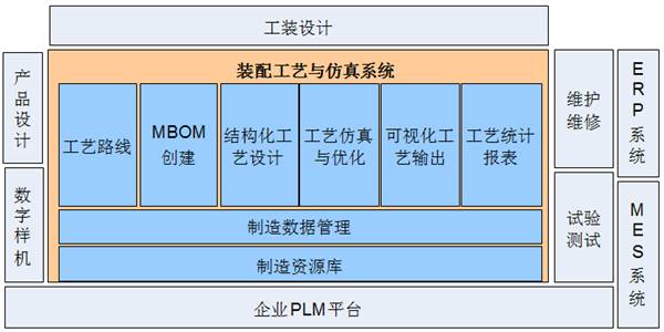 装配规划与验证建立于企业PLM平台之上,由流水分工、MBOM创建、结构化工艺设计、工艺仿真与优化、可视化工艺输出、工艺统计报表部分组成,并实现各环节的数据管理,与PLM系统共用制造资源库。系统与产品设计、工装设计、维护维修、试验测试等系统实现数据共享和协同,与ERP、MES实现系统集成,如下图所示。
